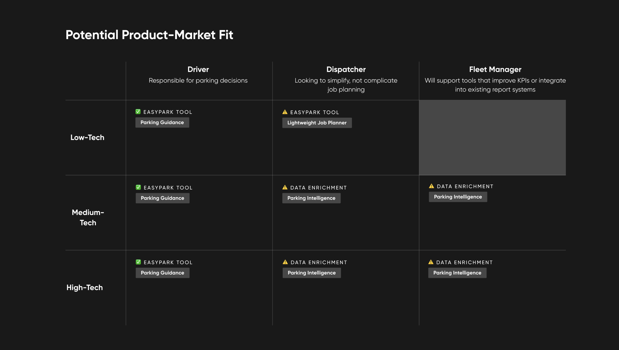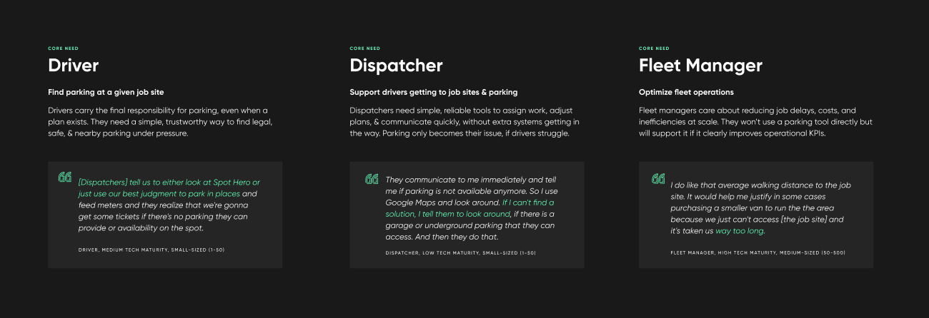 Our client had recently acquired a company with parking data they believed could use to unlock a new audience: fleet managers. Their idea was to create a solution for the fleet managers that would allow them to better manage routing and parking at job sites. We had six weeks to determine the viability of the idea and whether it would drive enterprise growth.